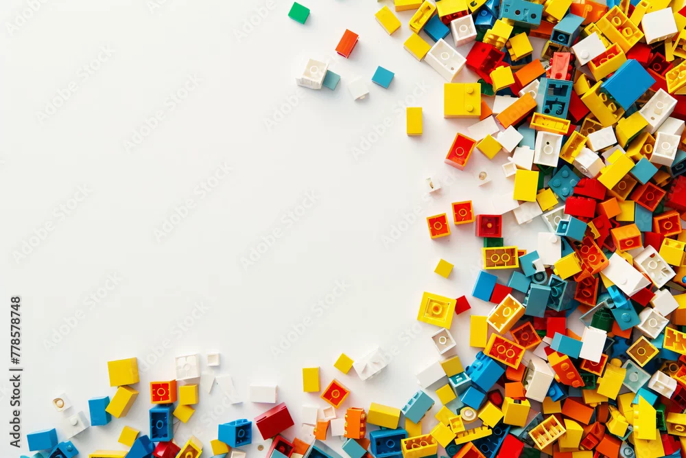 White background, white space in the center of picture. A pile of colorful blocks scattered all over the place. The bricks of different shapes and sizes to show diversity.