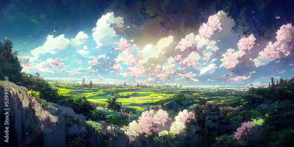 WIde Angle Japanese Anime Landscape Background. Clear Sky with Dynamic Cloud. Sakura Tree. Beautiful Scenery.