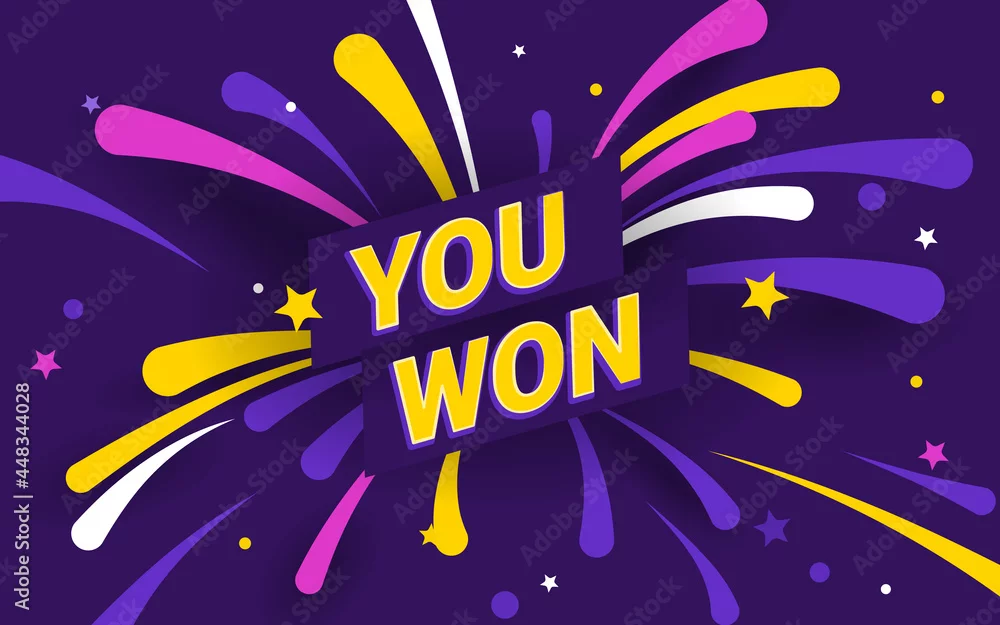 Win celebration illustration. Rich violet background with text you won and fireworks and stars on the background. Template banner for website, mailing ...
