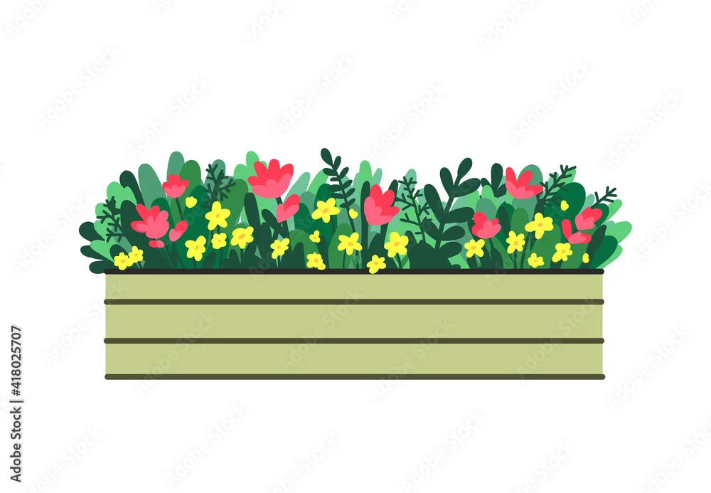 Window box with red and yellow flowers. Vector illustration in flat style.