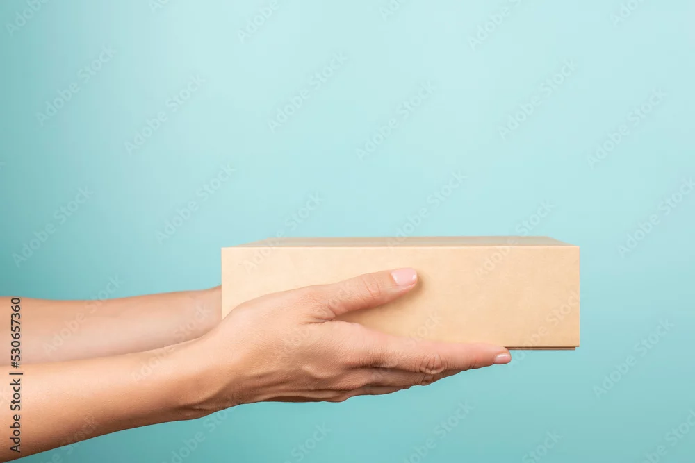 Woman hand holding brown rectangular cardboard box on light blue background. Mockup parcel box. Packaging, shopping, delivery, present, gift concept