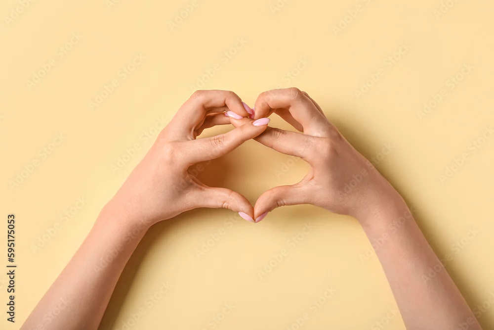 Woman making heart with her hands on beige background