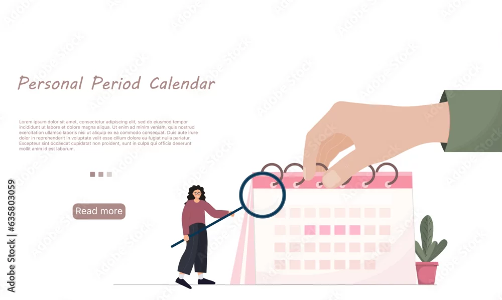 Woman watching personal period calendar, calendar for menstruation control and pregnancy planning, woman with mobile phone scheduling period with marked days, women cycle tracker, vector illustration