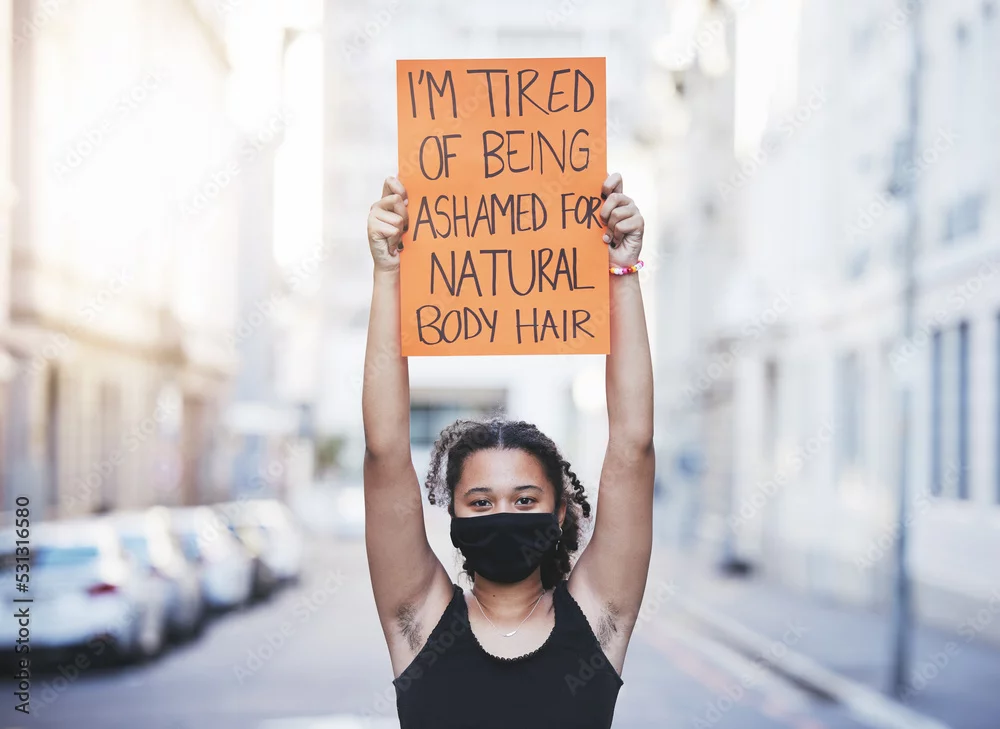 Women human rights, hair removal choice and protest, rally and feminist revolution against beauty standards, freedom and gender equality. Woman showing hairy body armpit, justice and poster opinion