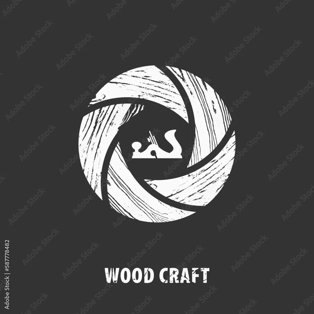 Wood craft logo in gray. Woodworks professional service. Aperture diaphragm in wood texture and jointer. Stock vector in gray for your web site design, logo, app, UI. EPS10.