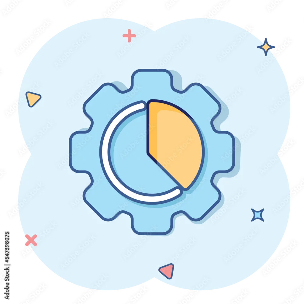 Workflow chart icon in comic style. Gear with diagram cartoon vector illustration on white isolated background. Process organization splash effect business concept.