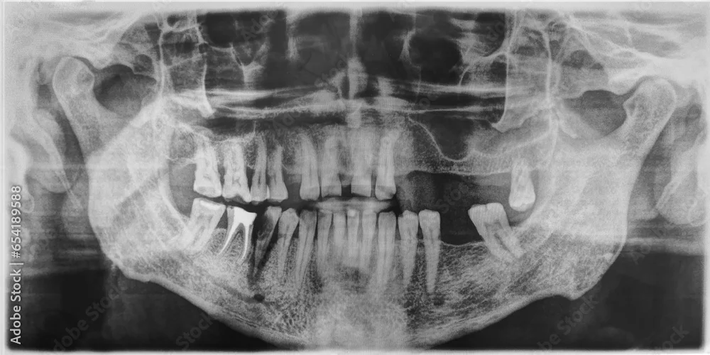 X-ray of bad, decayed teeth. Panoramic x-ray of the jaw and teeth at the dentist.