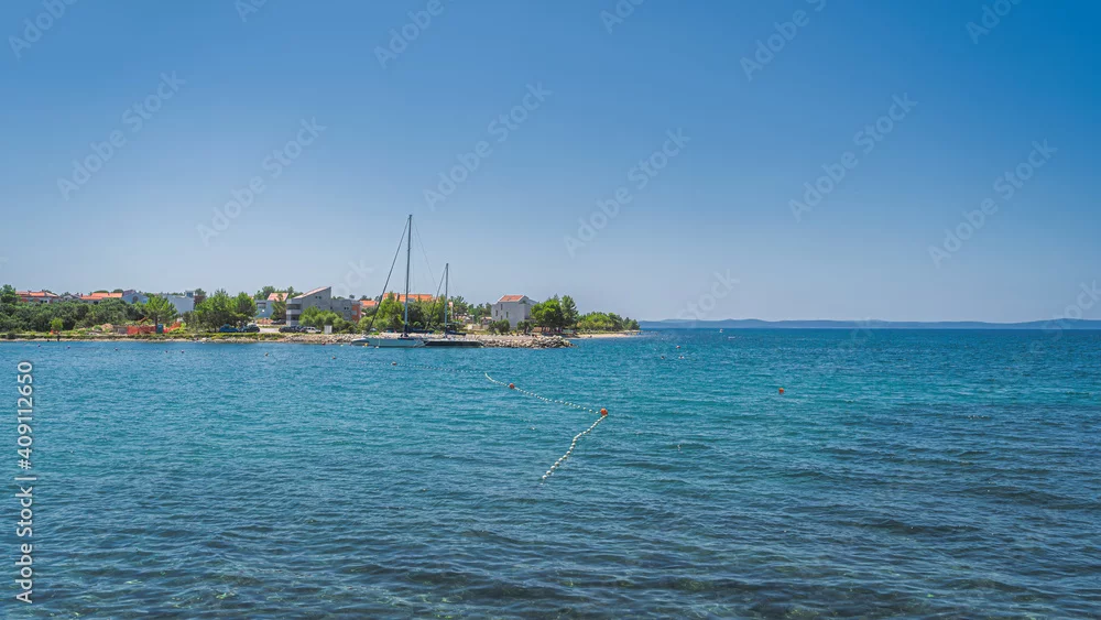 Yachts or sailboats moored at clear waters of Zaton bay with rocky coastline. Houses or resorts at the edge of turquoise water of Adriatic Sea Croatia
