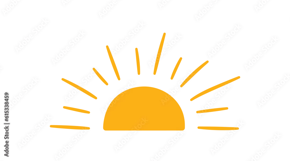 Yellow half sun icon in doodle style. Hand drawn sunset simple graphic symbol. Summer heat icon. Half round solar element. Vector illustration isolated ...