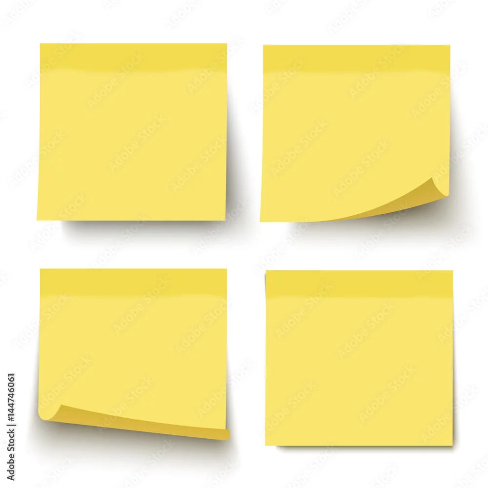 Yellow sticky notes. Vector illustration isolated on white background. Sticky note set with curled corners and shadows.