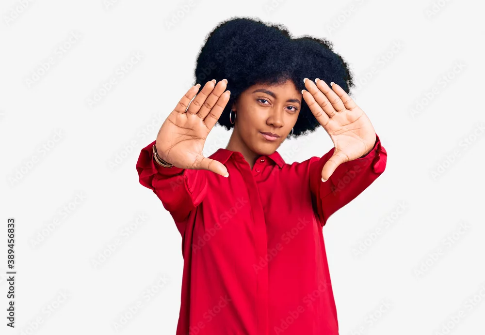 Young african american girl wearing casual clothes doing frame using hands palms and fingers, camera perspective
