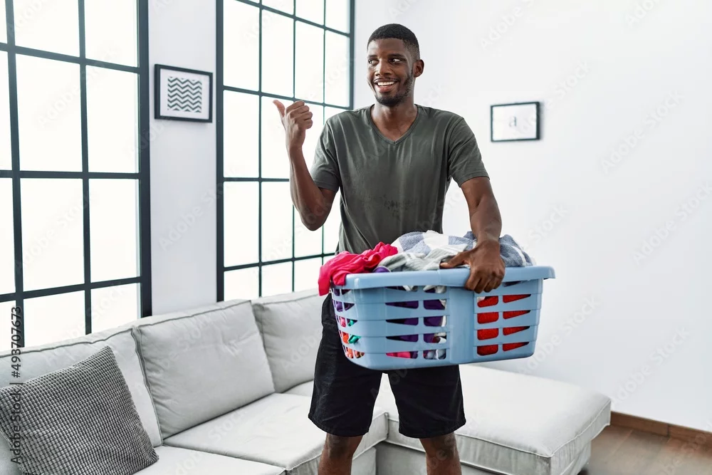 Young african american man doing laundry holding basket pointing thumb up to the side smiling happy with open mouth