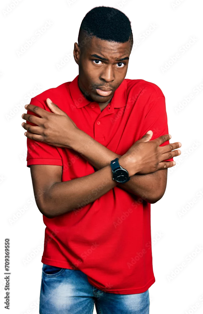 Young african american man wearing casual red t shirt shaking and freezing for winter cold with sad and shock expression on face