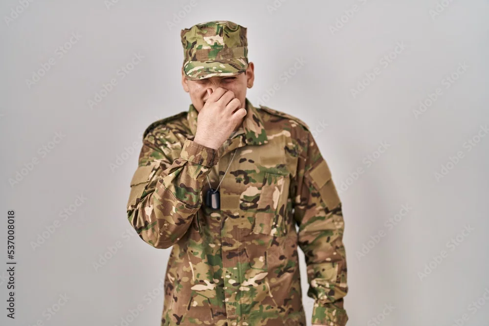 Young arab man wearing camouflage army uniform smelling something stinky and disgusting, intolerable smell, holding breath with fingers on nose. bad ...