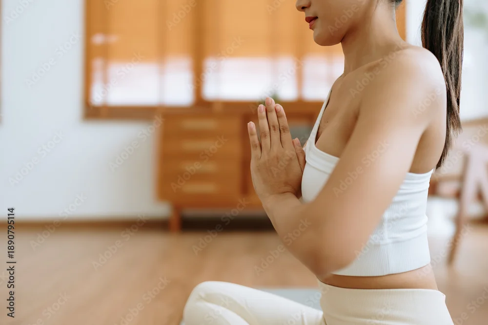 Young Asian woman meditating in lotus position at home, sitting on the floor in fitness clothing. Breathing workout to achieve relaxation, peace and mindfulness