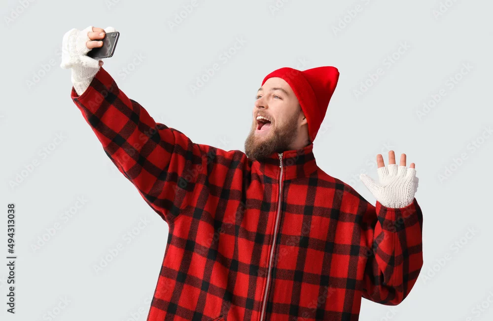 Young bearded man in warm gloves taking selfie on light background
