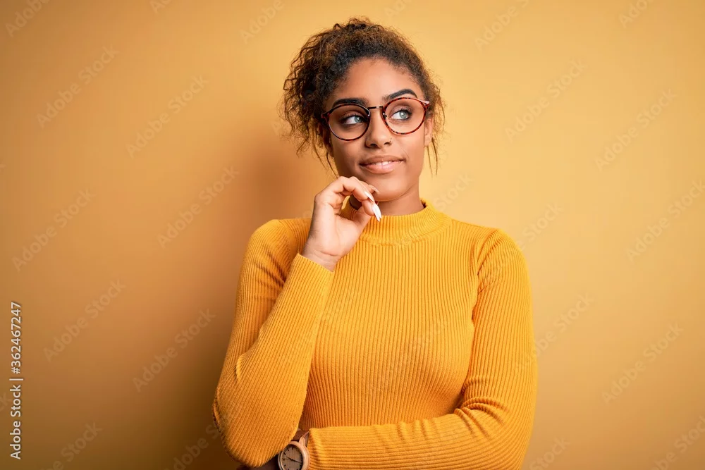 Young beautiful african american girl wearing sweater and glasses over yellow background with hand on chin thinking about question, pensive expression. Smiling and thoughtful face. Doubt concept.