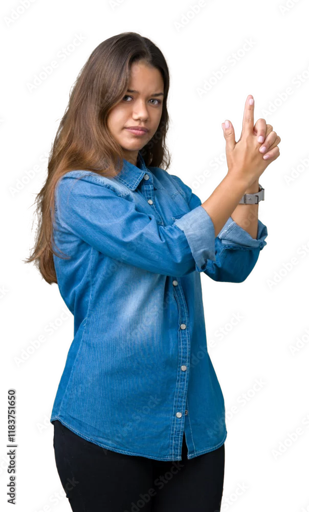 Young beautiful brunette woman wearing blue denim shirt over isolated background Holding symbolic gun with hand gesture, playing killing shooting weapons, ...