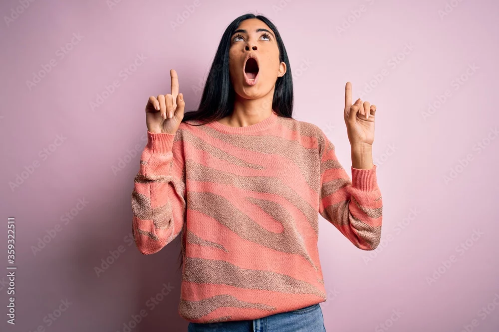 Young beautiful hispanic fashion woman wearing animal print sweater over pink background amazed and surprised looking up and pointing with fingers and raised arms.