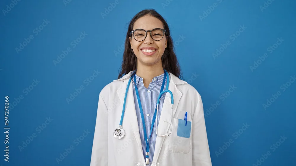 Young beautiful hispanic woman doctor smiling confident standing over isolated blue background