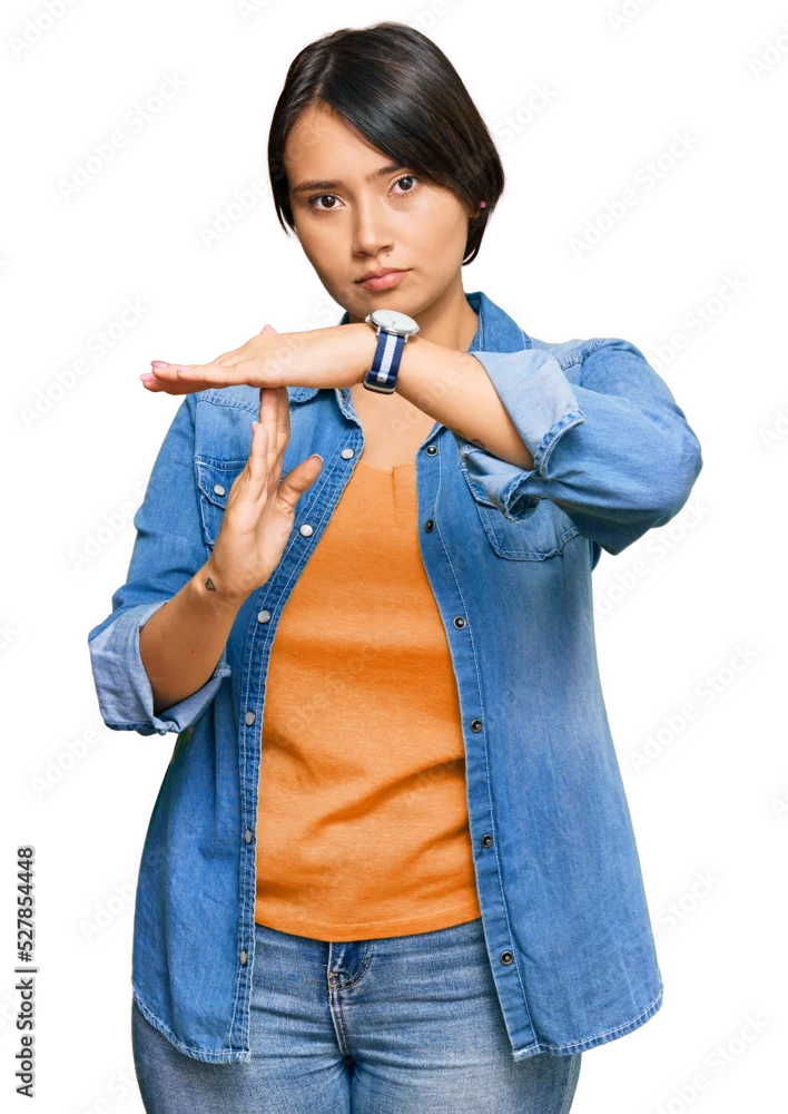 Young beautiful hispanic woman with short hair wearing casual denim jacket doing time out gesture with hands, frustrated and serious face