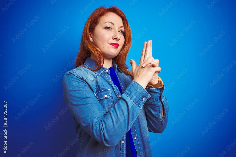 Young beautiful redhead woman wearing denim shirt standing over blue isolated background Holding symbolic gun with hand gesture, playing killing shooting ...