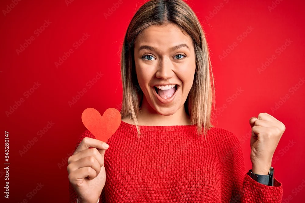 Young beautiful woman holding heart card standing over isolated red background screaming proud and celebrating victory and success very excited, cheering ...