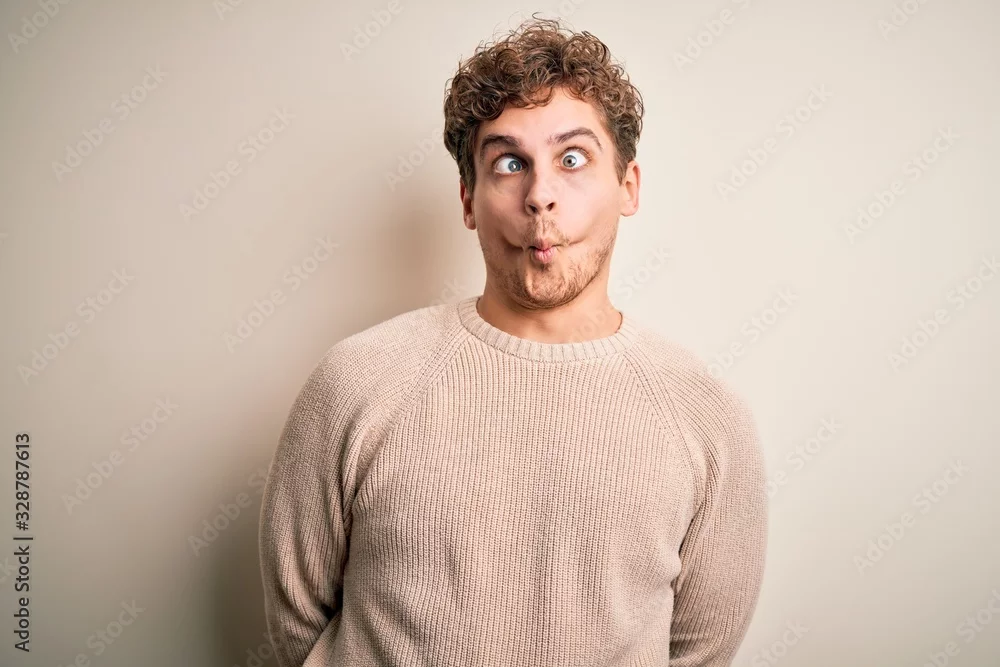 Young blond handsome man with curly hair wearing casual sweater over white background making fish face with lips, crazy and comical gesture. Funny ex ...