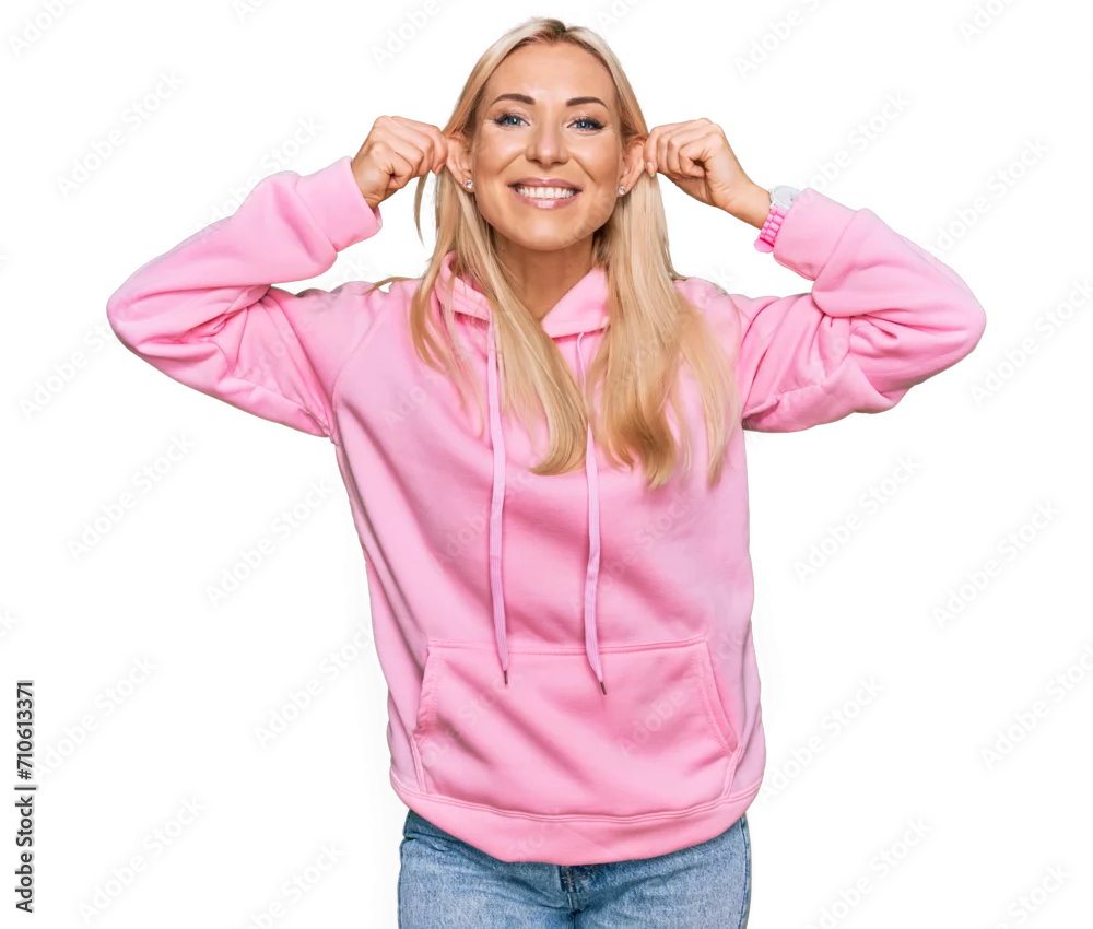 Young blonde woman wearing casual sweatshirt smiling pulling ears with fingers, funny gesture. audition problem