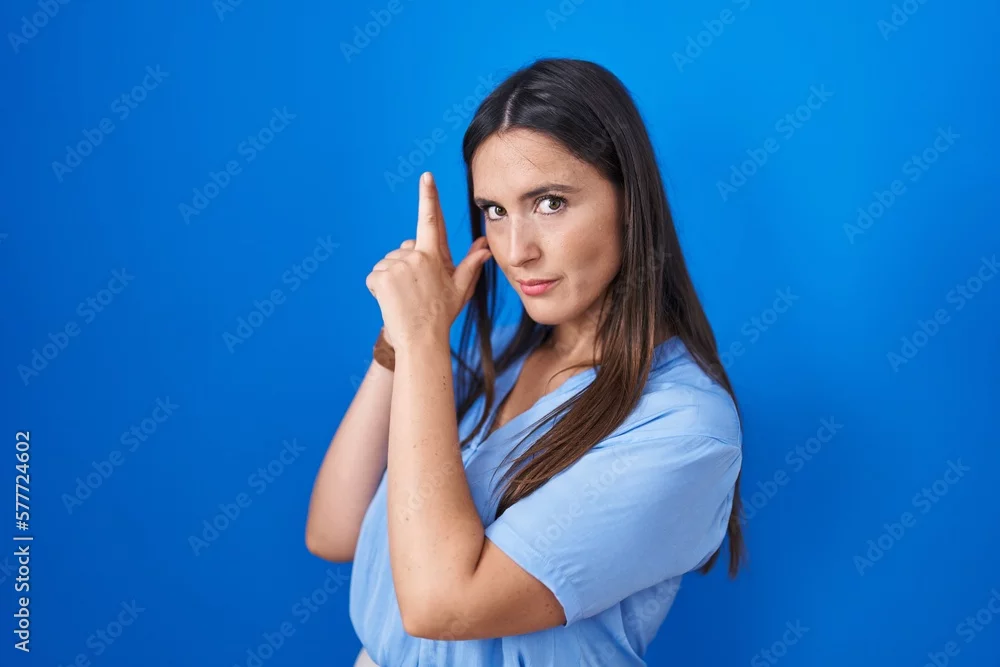 Young brunette woman standing over blue background holding symbolic gun with hand gesture, playing killing shooting weapons, angry face