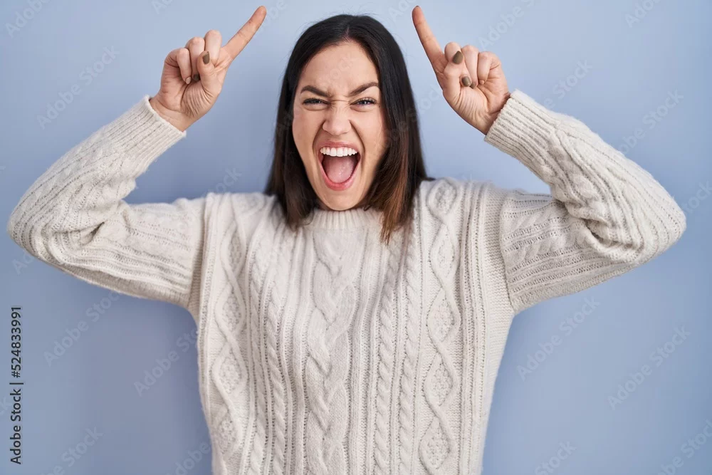 Young brunette woman standing over blue background smiling amazed and surprised and pointing up with fingers and raised arms.