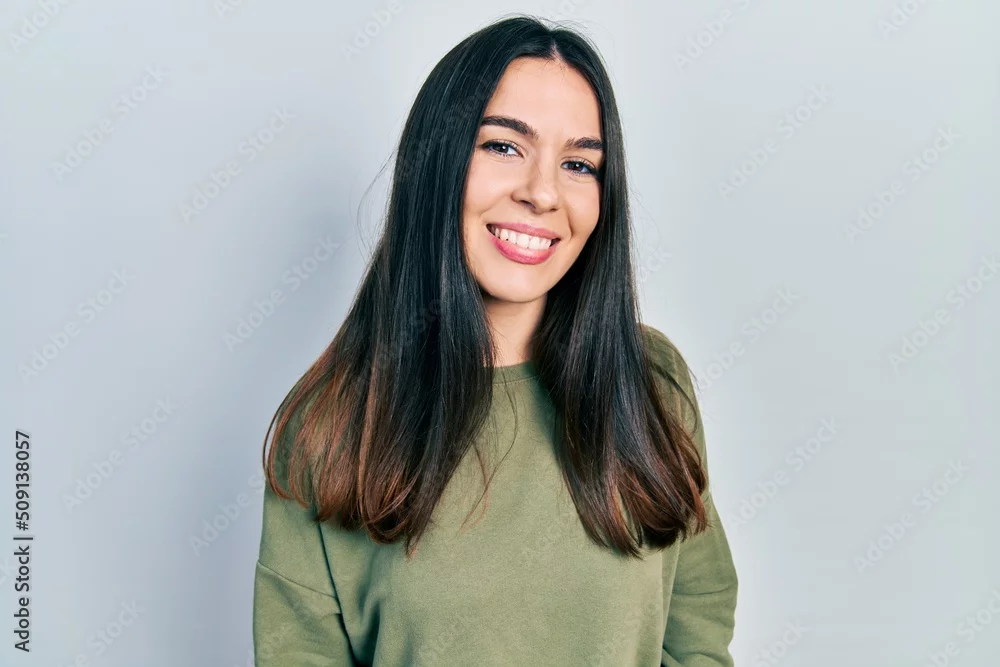 Young brunette woman wearing casual green sweater looking positive and happy standing and smiling with a confident smile showing teeth
