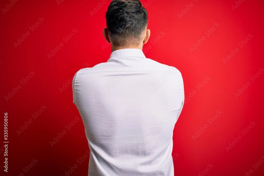 Young business man with blue eyes wearing elegant shirt standing over red isolated background standing backwards looking away with crossed arms