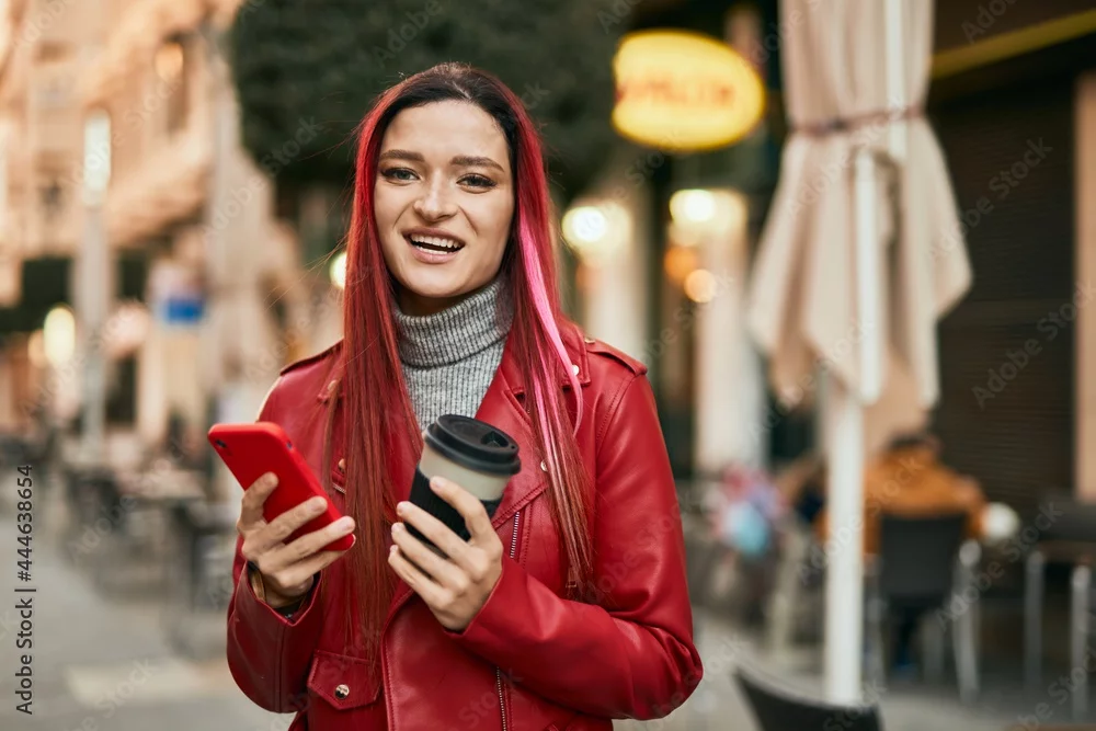 Young caucasian girl smiling happy using smartphone and drinking coffee at the city.