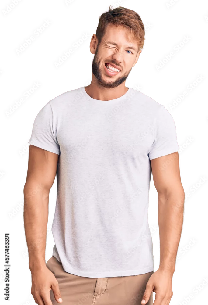 Young caucasian man wearing casual white tshirt winking looking at the camera with sexy expression, cheerful and happy face.