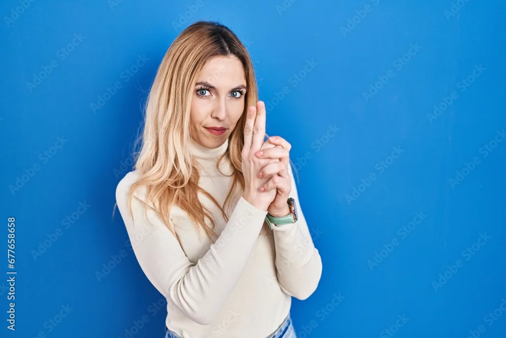 Young caucasian woman standing over blue background holding symbolic gun with hand gesture, playing killing shooting weapons, angry face