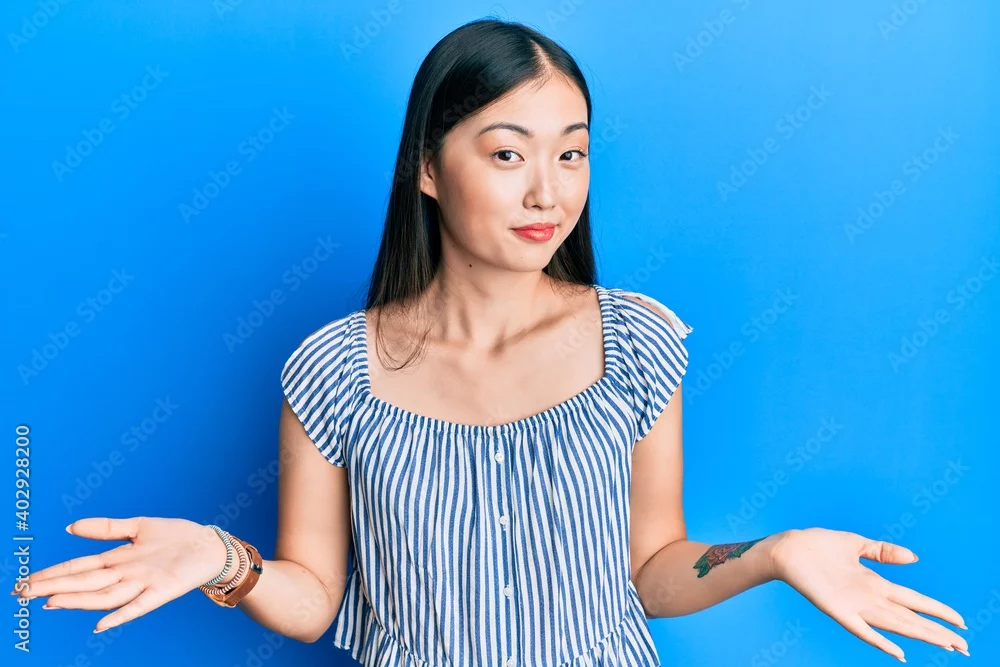 Young chinese woman wearing casual striped t-shirt clueless and confused expression with arms and hands raised. doubt concept.