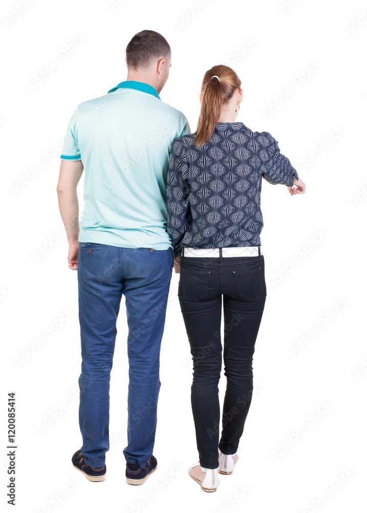 young couple pointing. Back view. Rear view people collection. backside view of person. Isolated over white background.