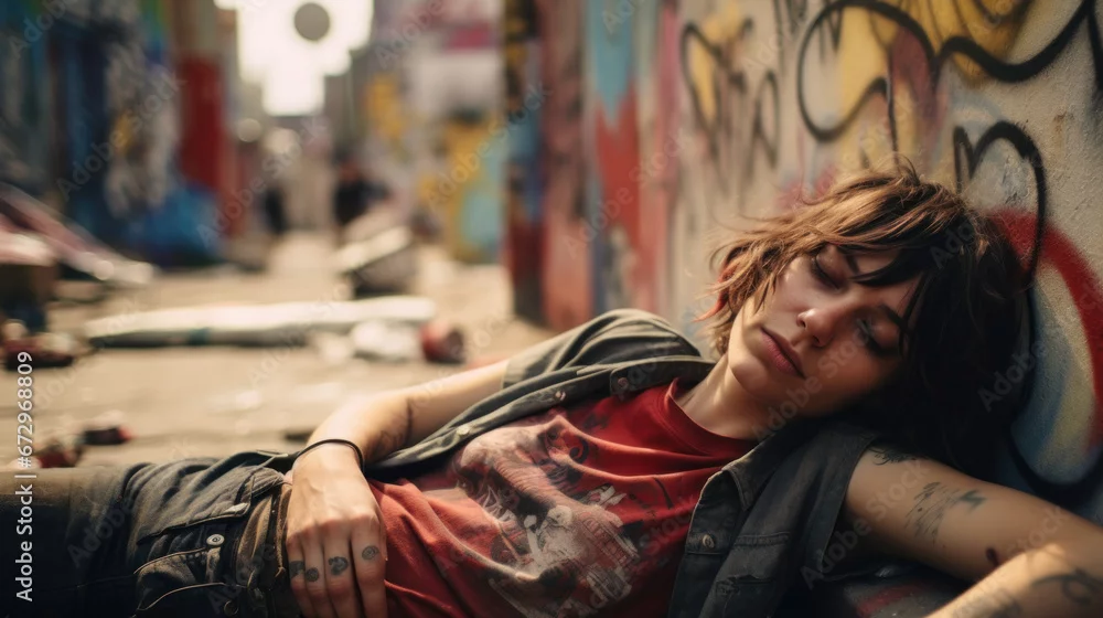 Young girl addicted to opiates lying on the street - modern fentanyl epidemic concept