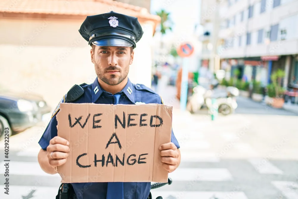 Young handsome hispanic policeman wearing police uniform with serious expression holding we need a change banner at town street