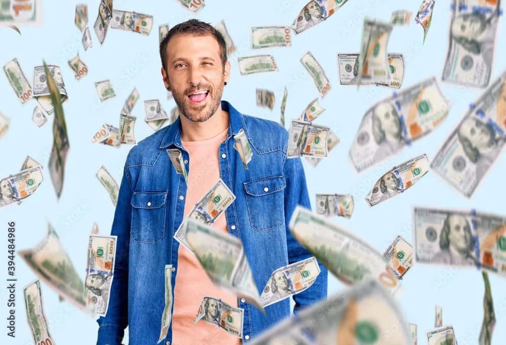 Young handsome man wearing casual clothes winking looking at the camera with sexy expression, cheerful and happy face.