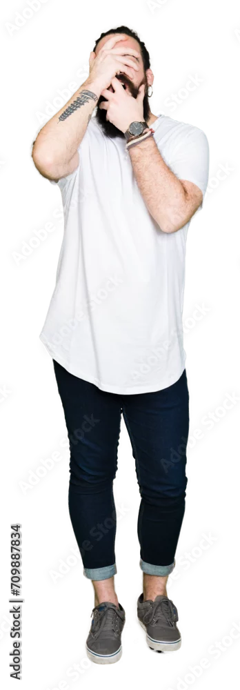 Young hipster man with long hair and beard wearing casual white t-shirt Covering eyes and mouth with hands, surprised and shocked. Hiding emotion