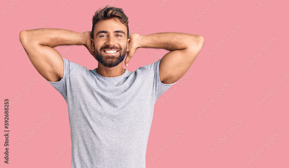 Young hispanic man wearing casual clothes relaxing and stretching, arms and hands behind head and neck smiling happy