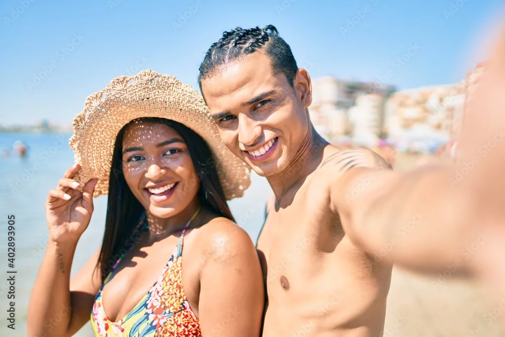 Young latin couple smiling happy making selfie by the camera at the beach.