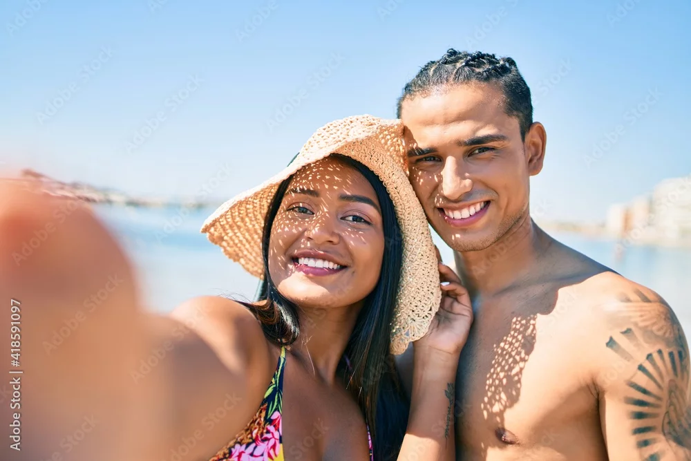 Young latin couple smiling happy making selfie by the camera at the beach.