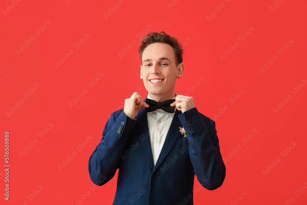 Young man in prom suit adjusting bow on red background