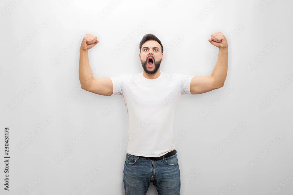 Young man screaming and yelling while posing. He is strong. Guy shows his muscles. Isolated on white background.
