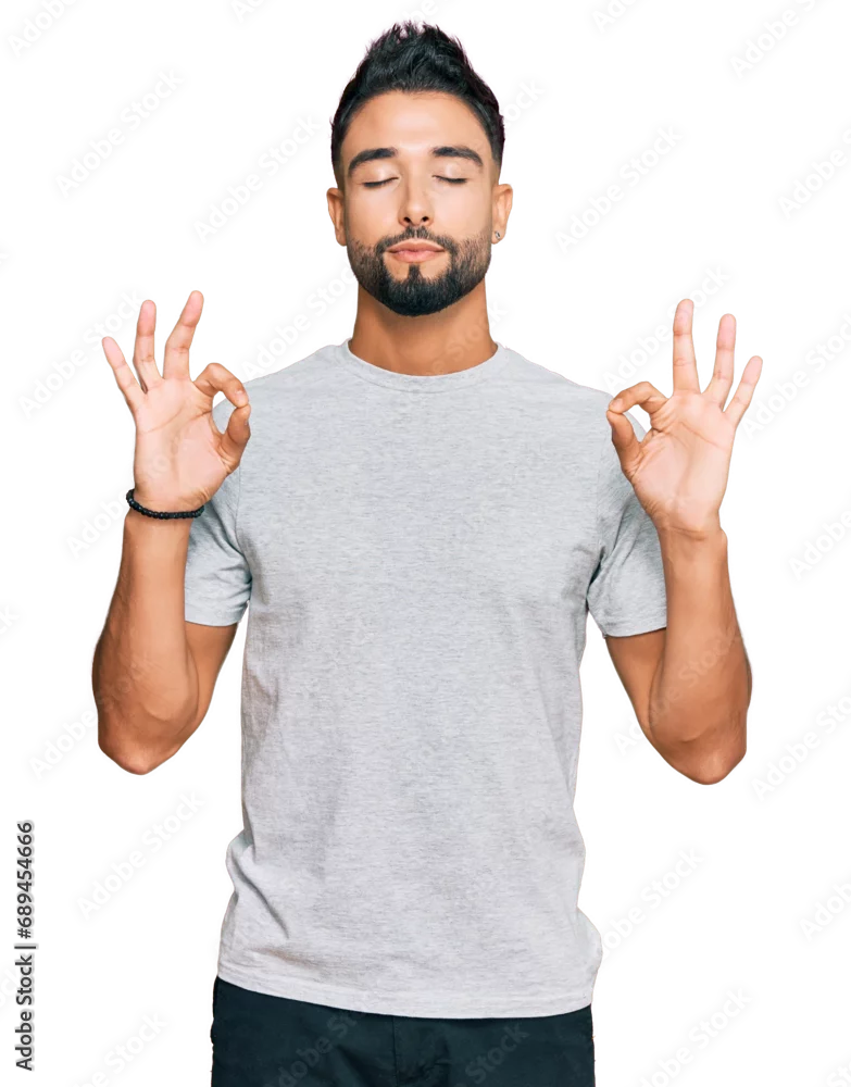 Young man with beard wearing casual grey tshirt relax and smiling with eyes closed doing meditation gesture with fingers. yoga concept.