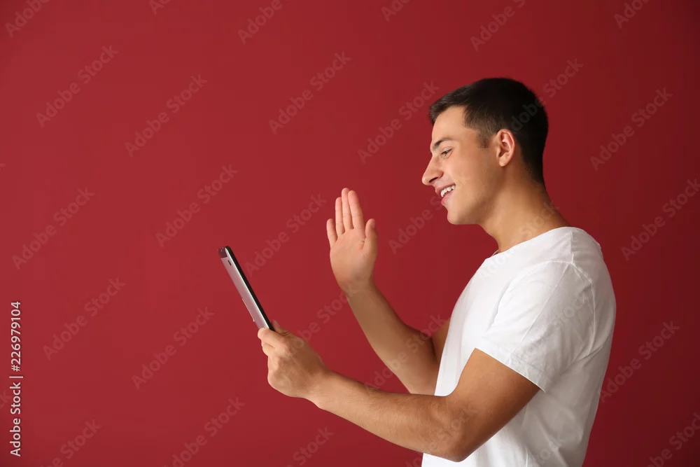 Young man with tablet computer having online dating, on color background