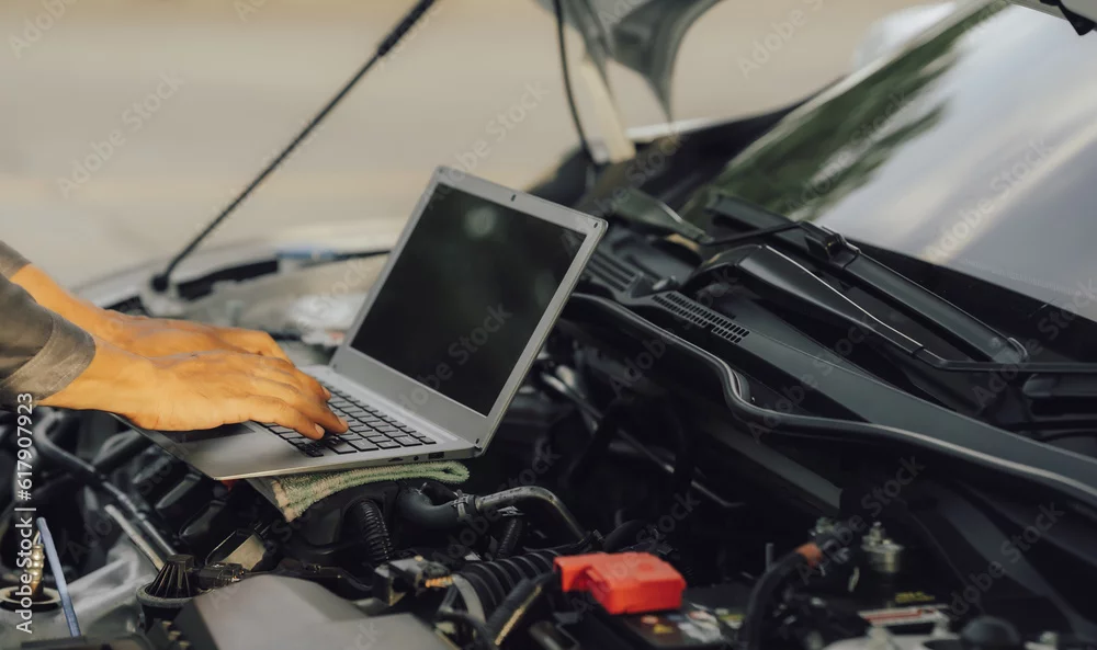 Young mechanic opens the bonnet to inspect the engine for damage and does professional maintenance. He puts on his uniform and inspects.